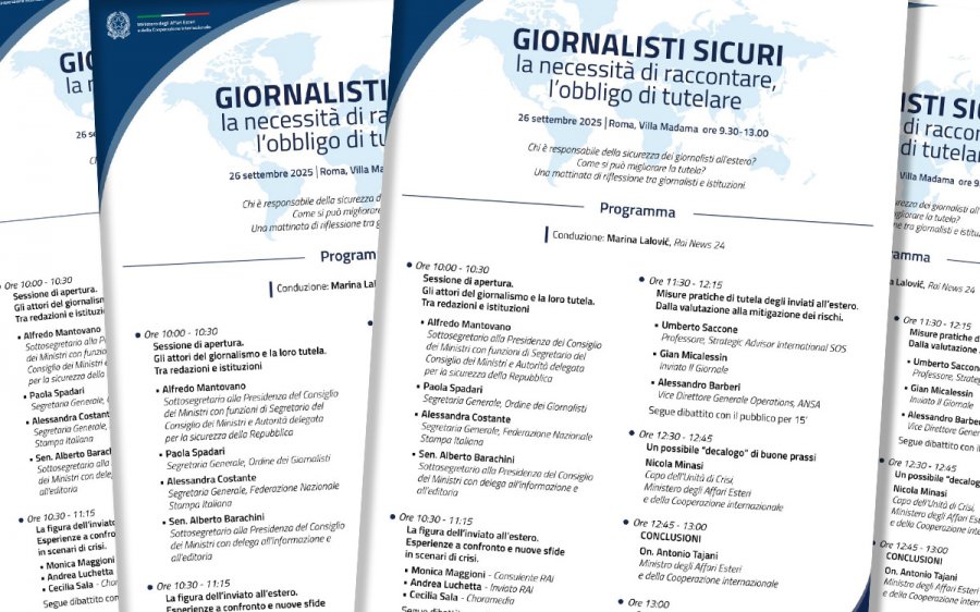 'Giornalisti sicuri: la necessità di raccontare, l'obbligo di tutelare'. Questo il titolo del seminario dedicato alla tutela dei cronisti inviati all'estero organizzato venerdì 26 settembre 2025, a Villa Madama, da presidenza del Consiglio dei ministri e ministero degli Affari esteri e della Cooperazione internazionale con la partecipazione dei vertici della Federazione nazionale della Stampa italiana e dell'Ordine dei giornalisti.