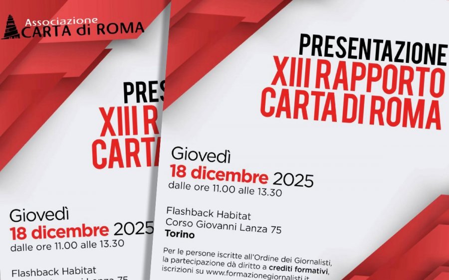In occasione della Giornata Internazionale delle Persone Migranti, giovedì 18 dicembre 2025, l'associazione Carta di Roma presenterà a Torino il suo XIII Rapporto annuale, realizzato in collaborazione con l'Osservatorio di Pavia e con il sostegno dell'8×1000 della Chiesa Valdese, del Consiglio nazionale dell'Ordine dei giornalisti, di Unhcr Italia, della Federazione nazionale della Stampa italiana e dell'Usigrai. L'appuntamento è dalle 11 alle 13.30, al Flashback Habitat, in corso Giovanni Lanza, 75.