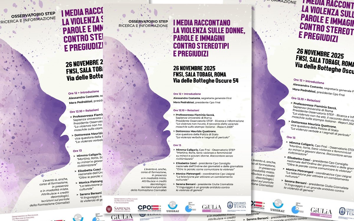 Un corso di formazione per approfondire l'evoluzione della narrazione, con numeri e attenzione agli aspetti deontologici del racconto della violenza di genere, alla luce del Manifesto di Venezia e del Testo unico dei giornalisti e delle giornaliste. L'appuntamento è per mercoledì 26 novembre 2025, dalle 12 alle 14, nella sede della Federazione nazionale della Stampa italiana, a Roma (via delle Botteghe Oscure 54 - 1° piano) e online.