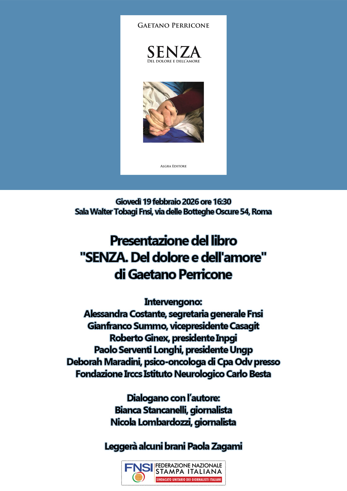 L'appuntamento è per giovedì 19 febbraio 2026, alle 16.30, in sala Walter Tobagi (via delle Botteghe Oscure, 54 - primo piano). Con l'autore e con la dottoressa Maradini ricorderanno Daniela, e discuteranno del libro e dei temi che esplora, la segretaria generale Fnsi Alessandra Costante, il vicepresidente di Casagit Gianfranco Summo, il presidente dell'Inpgi Roberto Ginex, i giornalisti Nicola Lombardozzi e Bianca Stancanelli e il presidente Ungp Paolo Serventi Longhi. Paola Zagami leggerà alcuni brani di 'Senza'. (mf)