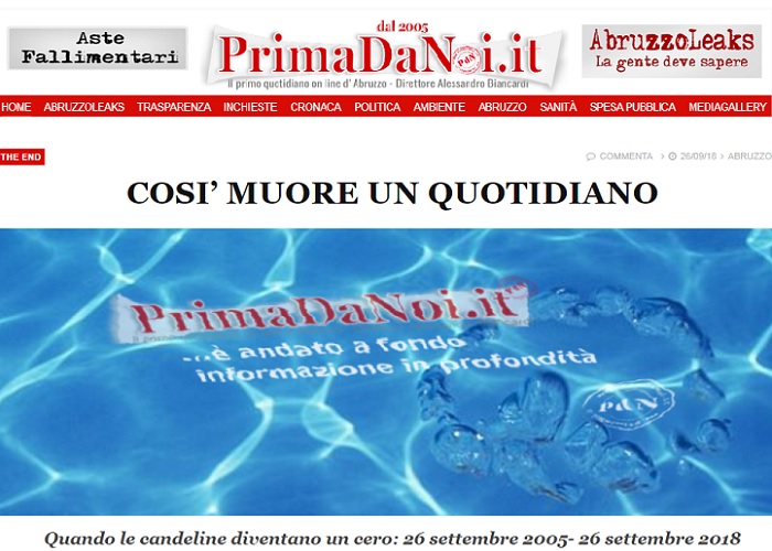 Ma la chiusura di 'PrimaDaNoi', incalzano i rappresentanti dei giornalisti abruzzesi, «ci racconta anche l'ennesima storia di attacchi alla professione giornalistica, che passa attraverso le citazioni e le querele temerarie, minacce e ritorsioni da parte di chi di libertà di stampa non vuole sentire parlare. Per questo il sindacato e l'Ordine dei giornalisti d'Abruzzo, sostenuti dalla Fnsi, annunciano una mobilitazione che coinvolgerà anche quei rappresentanti delle istituzioni che ancora credono nella democrazia e nella libertà di stampa, altri sindacati e la società civile, per rilanciare i temi della libera informazione e della sostenibilità economica delle testate giornalistiche».