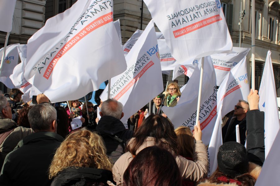 In piazza anche il presidente della Federazione nazionale della Stampa, Vittorio di Trapani, il presidente dell'Ordine dei Giornalisti, Carlo Bartoli; il presidente dell'Inpgi, Roberto Ginex con il vicepresidente, Mattia Motta; il segretario dell'Usigrai, Daniele Macheda, i colleghi e le colleghe della segreteria e della Giunta esecutiva della Fnsi, della Casagit, della Fondazione Murialdi e del Fondo di previdenza completamentare, segretari e presidenti delle Assostampa Regionali e degli Ordini regionali dei giornalisti, componenti dei Cdr, rappresentanti dei giornalisti lavoratori autonomi, delle associazioni Pluralismo e Libertà e Rete NoBavaglio.