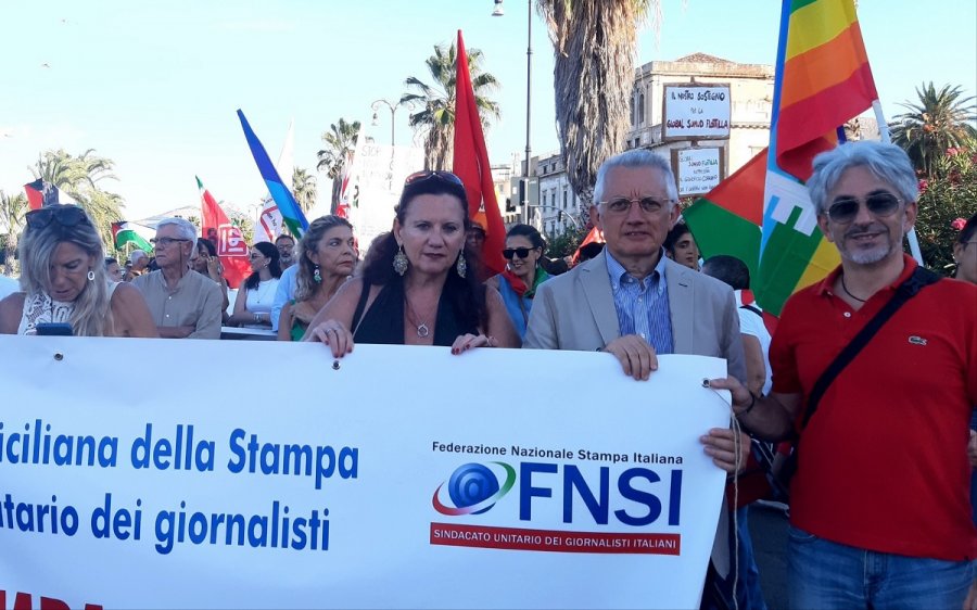 Sindacato dei giornalisti in piazza, sabato 6 settembre 2025, insieme con la Cgil alle manifestazioni organizzate dalla Confederazione in numerose città d'Italia per chiedere di fermare la barbarie a Gaza ed esprimere pieno sostegno all'azione umanitaria, pacifica, pacifista e non violenta promossa dalla Global Sumud Flotilla.