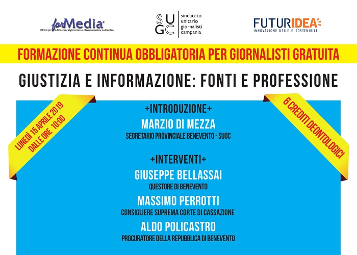 'Giustizia e informazione: fonti e professione', è il titolo del corso di formazione per giornalisti da sei crediti deontologici che si terrà a Benevento (piano Cappelle) nella sede di Futuridea e del Sugc il prossimo 15 aprile dalle ore 10 alle 14. Un evento, organizzato dal segretario provinciale del Sugc di Benevento, Marzio Di Mezza, per riflettere su un tema fondamentale della professione giornalistica con relatori di primo piano. Interverranno Giuseppe Bellassai, questore di Benevento; Massimo Perrotti, consigliere della Corte di Cassazione; Aldo Policastro, procuratore della Repubblica di Benevento; Giuseppe Giulietti, presidente della Fnsi; Claudio Silvestri, segretario regionale del Sugc. Iscrizioni tramite la piattaforma Sigef.