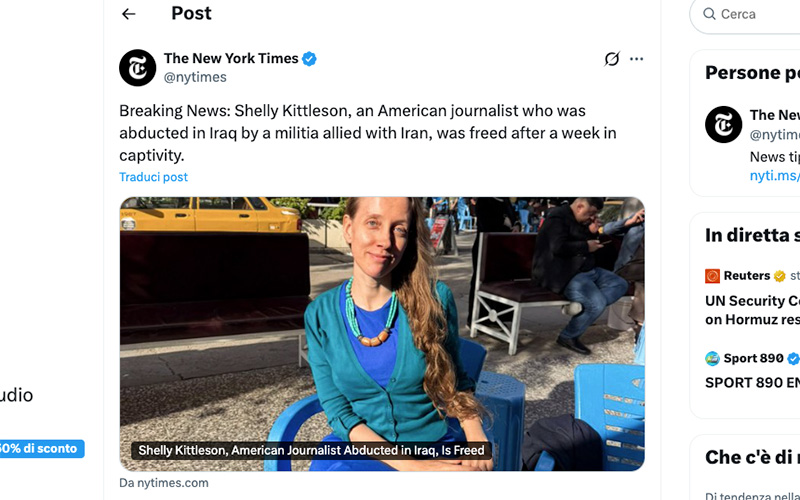 La giornalista è stata rilasciata in cambio della liberazione di alcuni prigionieri di Kaitab Hezbollah, secondo quanto riferito da due funzionari iracheni. (Ansa, 7 aprile 2026)