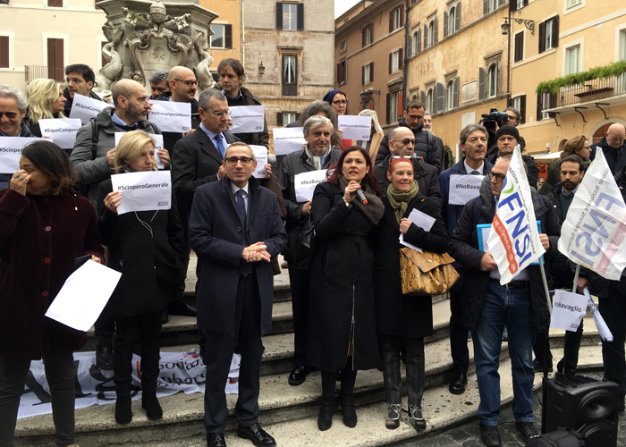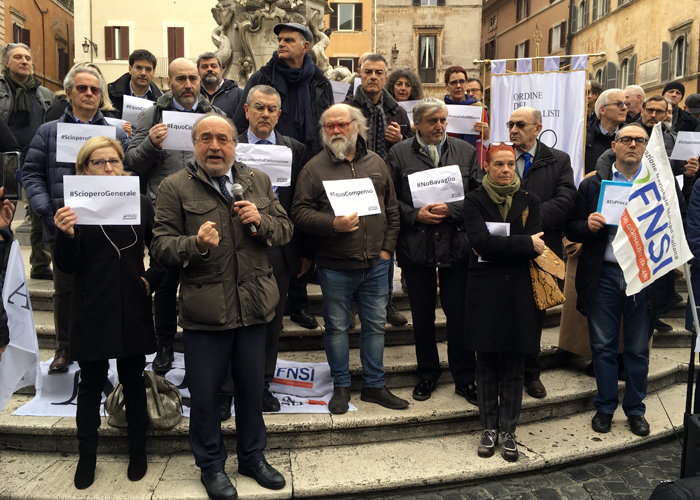In piazza con i vertici del sindacato anche i rappresentanti degli altri enti della categoria, Inpgi, Ordine dei giornalisti, Casagit e i presidente di alcune Casse di previdenza dei professionisti aderenti all'Adepp.