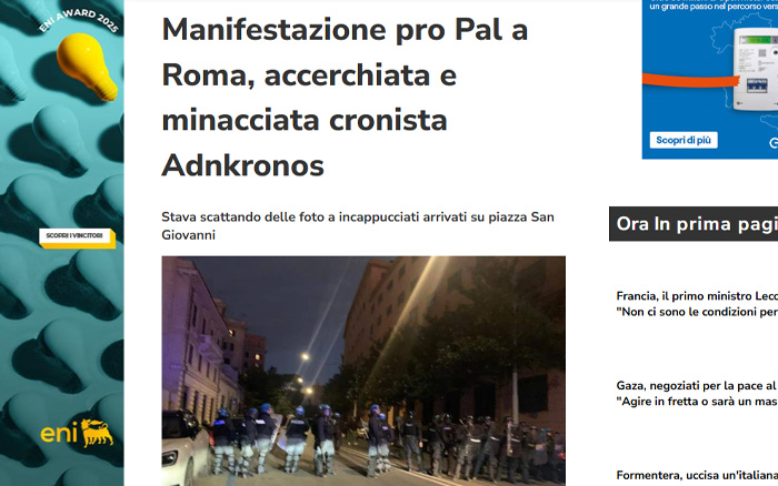 Una cronista dell’Adnkronos è stata accerchiata e minacciata da persone incappucciate a Roma sabato 4 ottobre 2025, nella giornata caratterizzata dalla manifestazione per Gaza. Lo riporta l’agenzia sul suo sito web, aggiungendo che il gruppo di incappucciati, che si trovava nel corteo pro Pal, arrivato a piazza San Giovanni, è stato fischiato dai manifestanti e cacciato: «Andate via», hanno urlato dalla piazza.