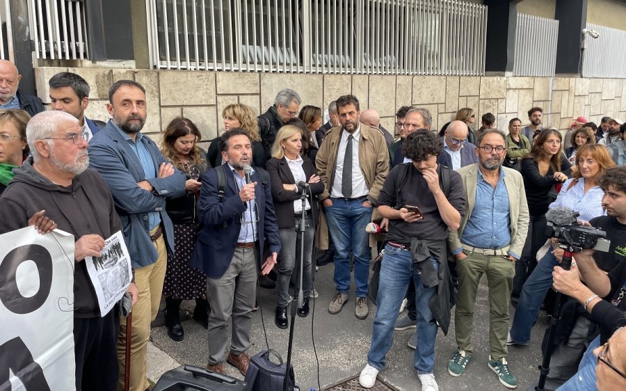 Federazione nazionale della Stampa italiana in piazza, a Roma, sotto la sede Rai di via Teulada con Usigrai e Stampa Romana, per esprime la solidarietà e vicinanza del sindacato a Sigfrido Ranucci all'indomani dell'attentato al giornalista conduttore di Report le cui auto sono state distrutte da un ordigno piazzato davanti casa nella notte tra il 16 e il 17 ottobre 2025.