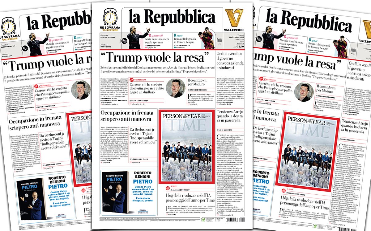 «L'assemblea delle giornaliste e giornalisti di Repubblica, insieme alle lavoratrici e ai lavoratori degli altri settori, ha preso atto con profondo sconcerto dell'annuncio della proprietà della svendita di quel che resta del nostro gruppo editoriale, che in questi anni è stato smantellato pezzo dopo pezzo dall'attuale editore, John Elkann. L'assemblea ha decretato lo stato di agitazione permanente con la sospensione immediata della partecipazione a tutte le iniziative editoriali speciali e ha consegnato al comitato di redazione e alla RSU un primo pacchetto di cinque giorni di sciopero: per venerdì 12 abbiamo indetto il primo. Il giornale non sarà in edicola sabato 13 dicembre e il sito non sarà aggiornato dalle 7 di venerdì fino alle 7 di sabato». Lo si legge in un comunicato diffuso dall’assemblea di Repubblica giovedì 11 dicembre 2025.